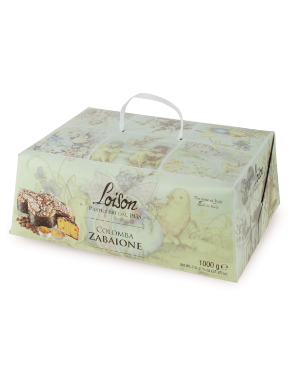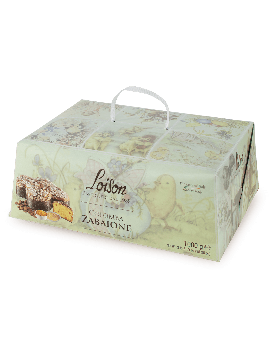 La Colomba de Pâques au sabayon est un gâteau moelleux à base de levain naturellement fermenté. Sa forme ovale irrégulière rappelle celle d’une colombe. La pâte, souple et bien alvéolée, est fourrée d’une délicieuse crème de sabayon et enrichie d’écorces d’orange sicilienne confites. La surface est recouverte de glaçage aux amandes italiennes et de sucre cristallisé.