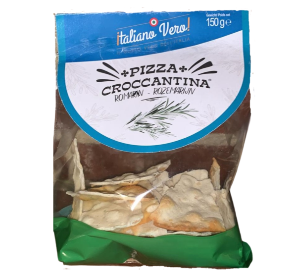 Pizza Croccantina au romarin est une spécialité de la gastronomie italienne, trouvant ses origines dans la région du Latium (Rome). Lentement cuite au four, sans ajout d’huile ni de matière grasse, elle ne contient ni exhausteur de goût, ni conservateur, ni colorant artificiel.